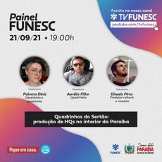 A Fundação Espaço Cultural da Paraíba (Funesc) realiza nesta terça-feira (21), a partir das 19h, mais uma edição do ‘Painel Funesc’, cujo tema em debate será “Quadrinhos do Sertão: produção de HQs no interior da Paraíba”, mediado pela desenhista Paloma Diniz e com transmissão ao vivo via YouTube (youtube.com/funescpbgov). Os debatedores convidados são o quadrinista Aurélio Filho e o produtor cultural e cineasta Diassis Pires.