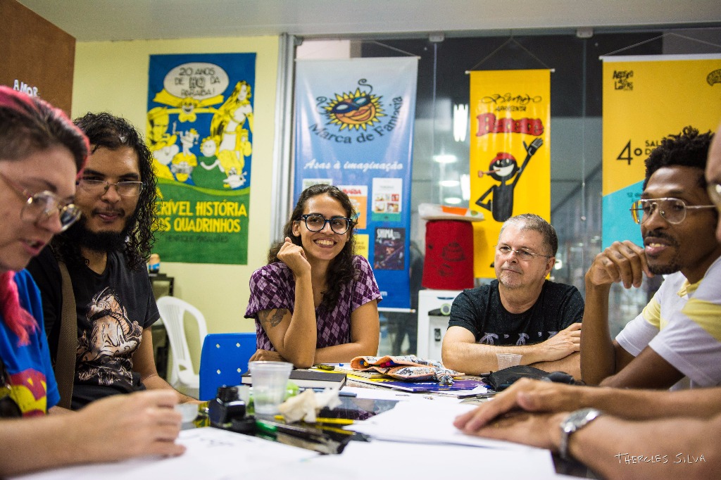 A chefe do Núcleo da Gibiteca Henfíl, Thaïs Gualberto, ladeada por quadrinistas durante uma das atividades regulares da Funesc