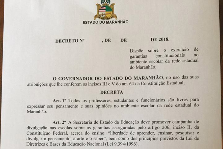 O texto assegura a professores, estudantes e funcionários liberdade para expressar os próprios pensamentos na rede estadual do Maranhão
