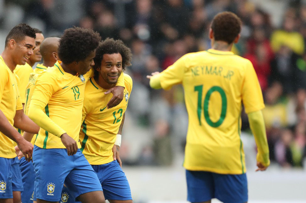 Marcelo comemora com os companheiros o segundo gol da seleção depois de um chute com a perna direita