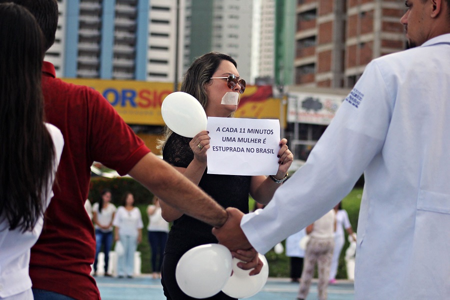 Funcionários do Trauma se vestiram de branco, com algumas mulheres de preto e com boca lacrada para protestar sobre a violência contra a mulher