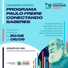 O Governo da Paraíba, por meio da Secretaria de Estado da Educação e da Ciência e Tecnologia (SEECT-PB), divulgou no Diário Oficial do Estado desta quarta-feira (25), o edital do Programa Paulo Freire - Conectando Saberes, que fará a cessão de uso de computadores portáteis para todos os professores da Rede Estadual de Ensino com matrículas ativas. A estimativa é que 14 mil profissionais sejam contemplados. A ação representa um investimento de R$ 51 milhões. A previsão é que os professores recebam os computadores em setembro deste ano.