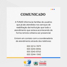 A Funad informa às famílias de usuários que já são atendidos nos serviços de reabilitação da Instituição que todo o atendimento que estava acontecendo de forma remota voltará a ser presencial.