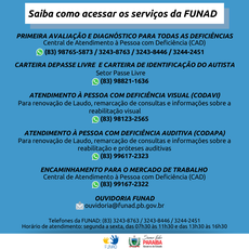 Saiba como acessar os serviços da FUNAD, de maneira remota, e realizar marcações de triagem, solicitar carteira de passe livre e de identificação do autista, remarcar consultas e obter informações sobre os serviços de reabilitação e encaminhamento para o mercado de trabalho: