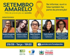 O Governo do Estado da Paraíba, através da Fundação Centro Integrado de Apoio ao Portador de Deficiência e do Centro de Referência em Esclerose Múltipla (CREM/PB) e em parceria com o Centro de Valorização da Vida (CVV) promoverá uma live no dia 29 de setembro (terça-feira), às 19h30 com o tema “Se informar, ouvir e falar também faz parte da prevenção”, em alusão ao Setembro Amarelo, campanha de conscientização sobre a prevenção ao Suicídio.
