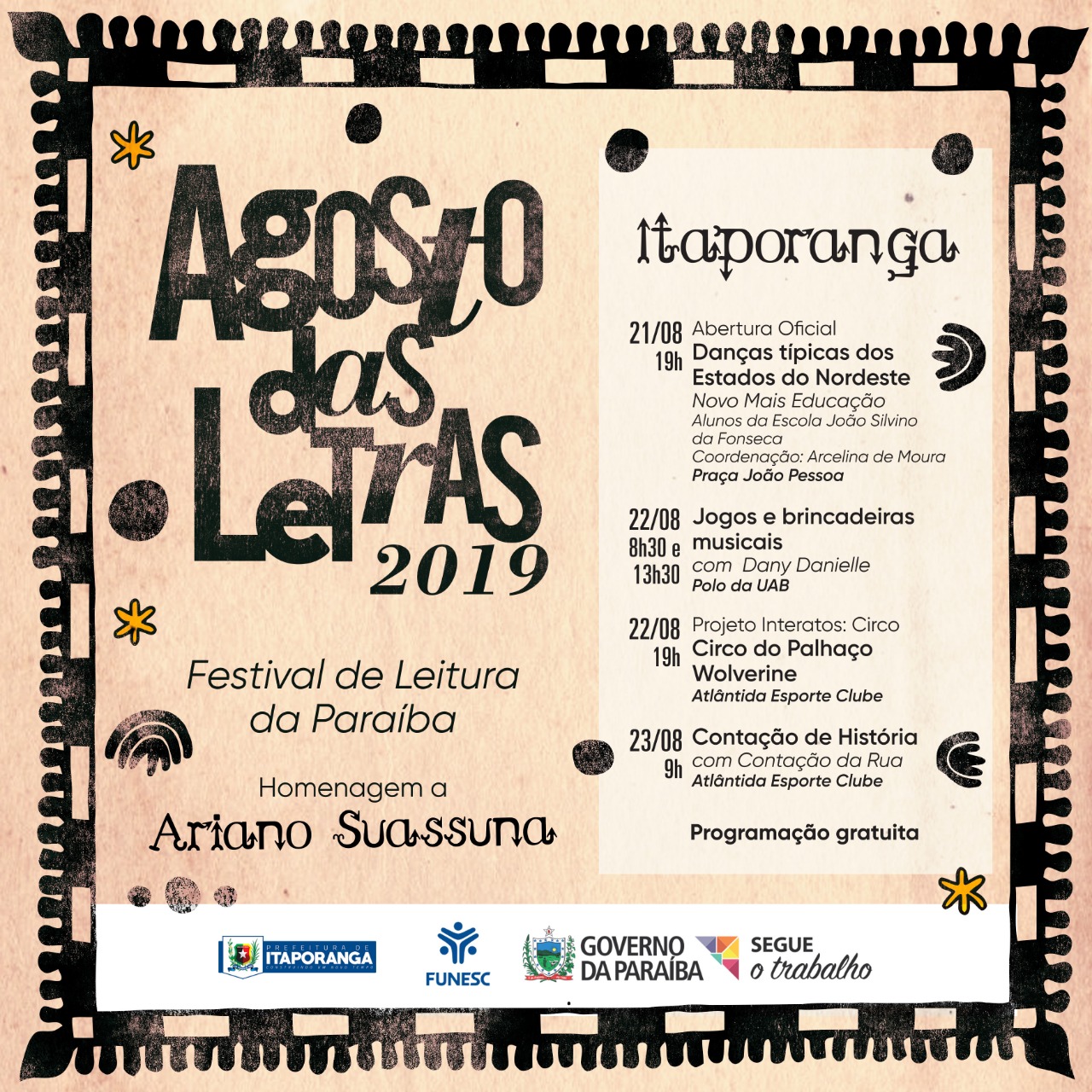 5ª edição do Agosto das Letras chega a Itaporanga com circo, dança e contação de história