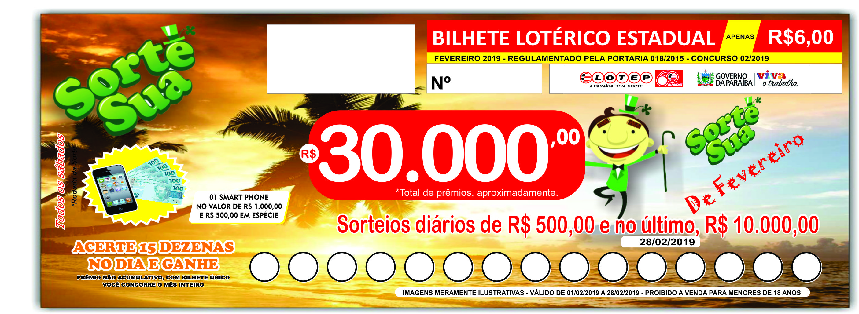O bilhete de fevereiro, já está sendo vendido pelo preço de R$ 6,00. Denominado “Sorte Sua”, o bilhete tradicional é vendido em todo estado em pontos credenciados. Comprando o bilhete, o apostador também está contribuindo com entidades filantrópicas que são conveniadas com a Lotep. Serão sorteadas 40 dezenas diárias, aonde o apostador deverá acertar 15 delas no dia para ser contemplado. Caso não haja ganhadores com 15 pontos, haverá um sorteio de R$ 10.000,00 por aproximação no último dia do mês (28/02/2019). Para conferir os números acesse o banner “Resultado das extrações” nesse portal, acessando o link “SORTE SUA”.