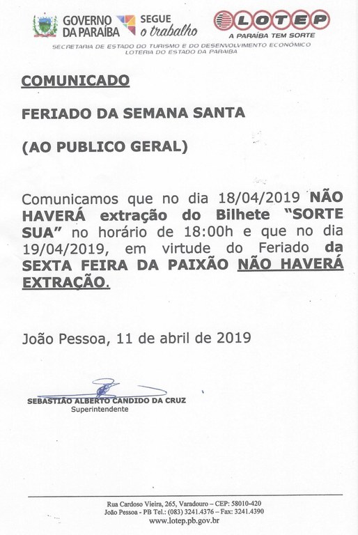 COMUNICADO OFICIAL (FERIADO DA SEMANA SANTA)