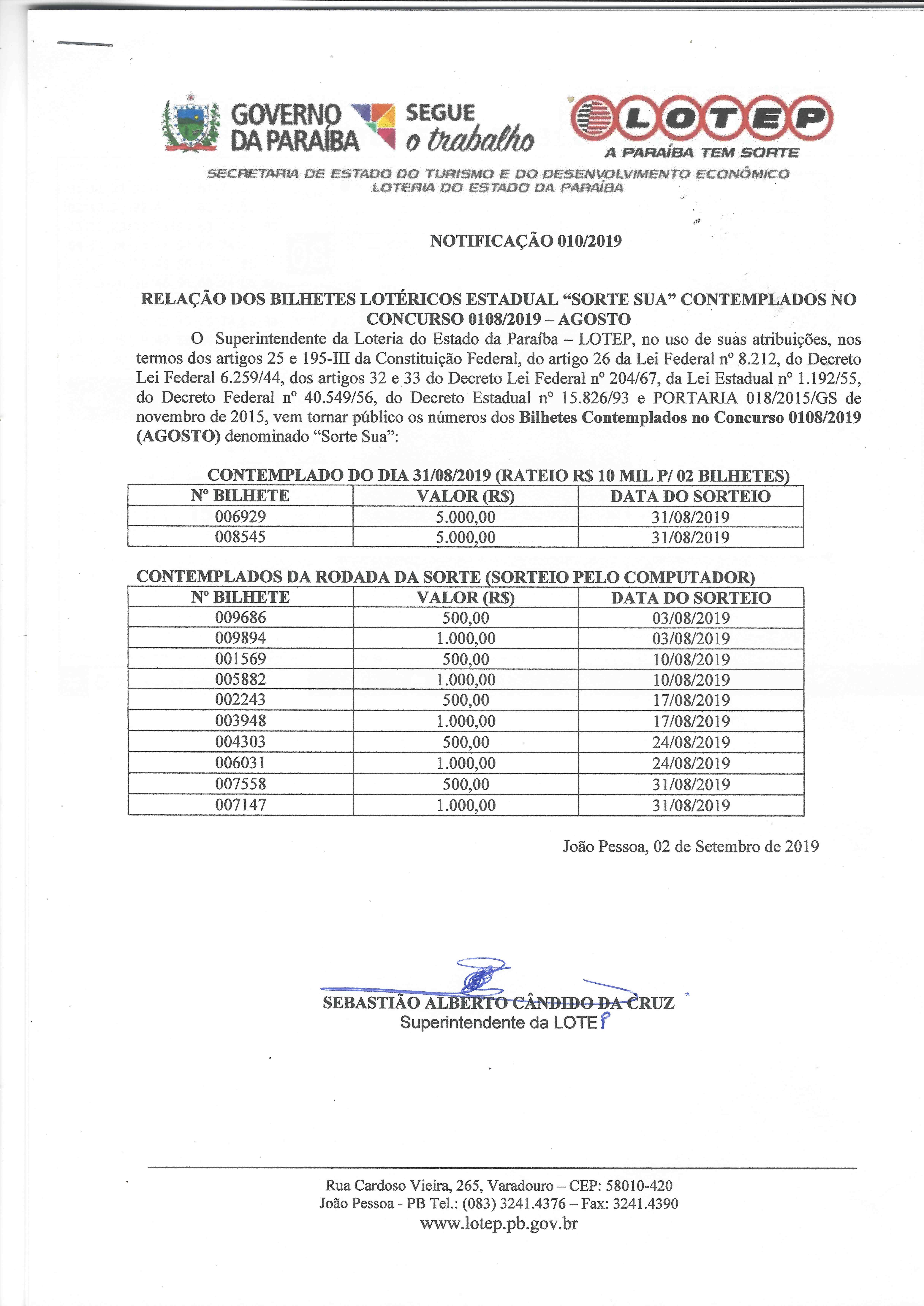 CONTEMPLADOS NO CONCURSO 0108 / AGOSTO / 2019
