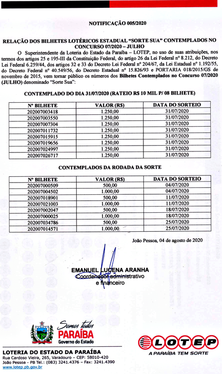 Você está aqui: Página Inicial > Adm. Indireta > LOTEP > Menu Principal > Notícias > CONTEMPLADOS NO CONCURSO 07- JULHO - 2020 (SORTE SUA)