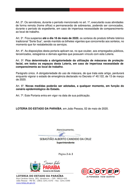 PORTARIA Nº 010/2020-LOTEP DE 02 DE MAIO DE 2020