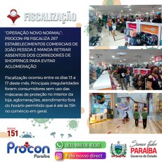 A operação “Novo normal” do Procon Estadual da Paraíba, fiscalizou 267 estabelecimentos comerciais entre os dias 13 a 17 deste mês, período da reabertura do comércio na capital paraibana com restrições de distanciamento, higiene e uso de máscaras de proteção. Alguns shoppings foram obrigados a retirar assentos localizados nos corredores e praças de lazer, para evitar aglomeração de pessoas.