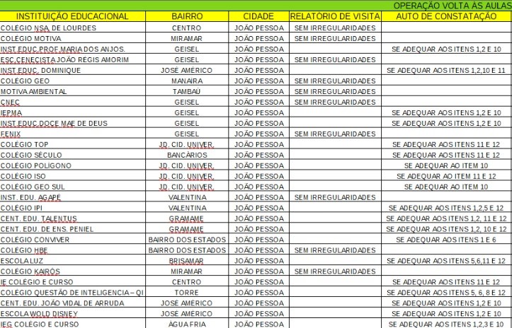 Confira na tabela abaixo o relatório divulgado pela equipe de fiscalização do Procon-PB em que mostra todas as escolas que foram fiscalizadas com as respectivas notificações elencadas em itens que podem ser consultados aqui.