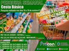 Completa – O preço da cesta básica nesta terceira semana de outubro apresenta diferença de R$ 84,98, em 60,51%. Vai de R$ 140,45 no Assaí (Geisel) até R$ 225,44 no Pão de Açúcar (Miramar).