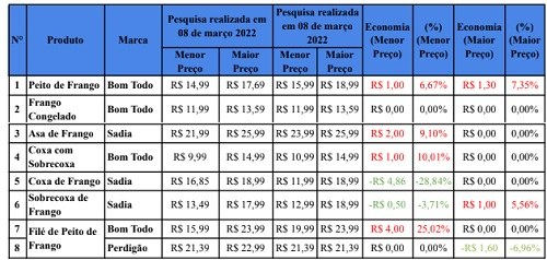 A pesquisa foi realizada em 11 estabelecimentos, no dia 08 de março, e 113 produtos entre cortes de carne bovina, suína, linguiça calabresa e cortes de frango entraram na lista