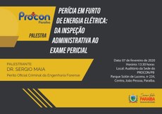 A Autarquia de Proteção e Defesa do Consumidor do Estado da Paraíba, PROCON-PB, órgão da administração indireta ligado a Casa Civil do Governador convida a todos interessados a participar, no dia 7 de fevereiro das 13h30 às 18h, da palestra “PERÍCIA EM FURTO DE ENERGIA ELÉTRICA: Da inspeção administrativa ao exame pericial” ministrada pelo Perito Oficial Criminal da Engenharia Forense do Instituto de Polícia Científica da Paraíba (IPC/PB) o Dr. Sérgio Maia. Evento possui como finalidade o cumprimento da Politica Estadual de Defesa do Consumidor do Estado da Paraíba.