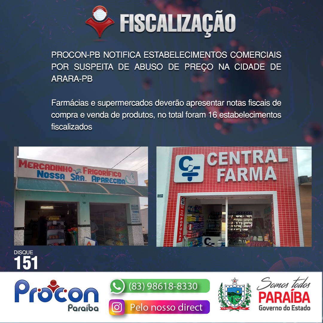 PROCON-PB NOTIFICA ESTABELECIMENTOS COMERCIAIS POR SUSPEITA DE ABUSO DE PREÇO NA CIDADE DE ARARA-PB