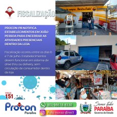 O Procon Estadual da Paraíba notificou estabelecimentos comerciais para encerrar atividades dentro da loja conforme Decreto Estadual do Governo do Estado de combate à Covid-19. De acordo com os fiscais da Autarquia de Proteção e Defesa do Consumidor da Paraíba (Procon-PB) outras irregularidades encontradas foram com base no Código de Defesa do Consumidor.