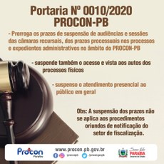 A Autarquia de Proteção e Defesa do Consumidor da Paraíba (PROCON/PB), informa a todos, em portaria de Nº 0010/2020 publicada em 26 de junho de 2020, que prorroga os prazos de suspensão de audiências e sessões das câmaras recursais, do curso dos prazos processuais nos processos e expedientes administrativos, bem como o acesso e vista aos autos dos processos físicos, e o atendimento presencial ao público em geral do PROCON/PB, conforme o disposto no Parágrafo Único, do Artigo 5º, do Decreto Estadual nº 40.135/2020, até ulterior deliberação.