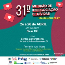 A Autarquia de Proteção e Defesa do Consumidor da Paraíba, PROCON-PB, realizará o 31º Mutirão de Renegociação de Dívidas, entre os dias 26 a 28 de abril das 08h às 13h no Procon Estadual Núcleo de Mamanguape, no Centro Cultural Fênix, localizado à rua Barão do Rio Branco, S/N, Centro, Mamanguape.